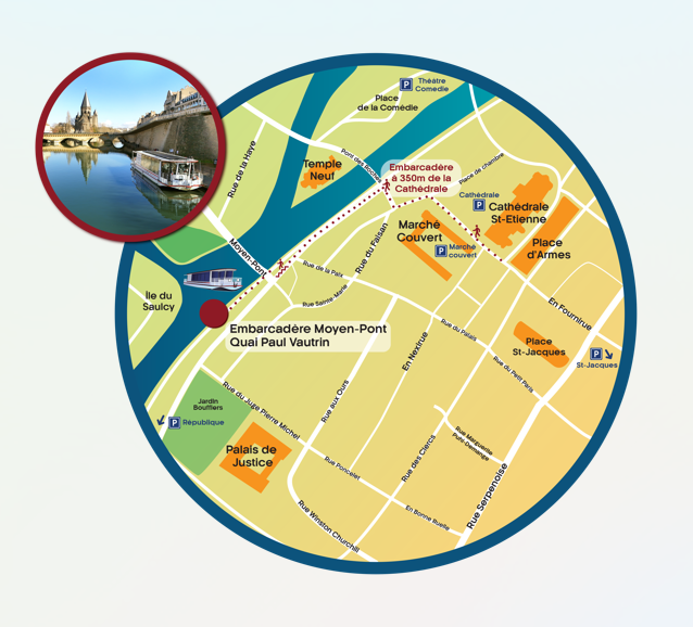 En bas du Quai Paul Vautrin, à moins de 4 minutes à pied de la cathédrale. Entre le Moyen Pont et les Régatesmessines.